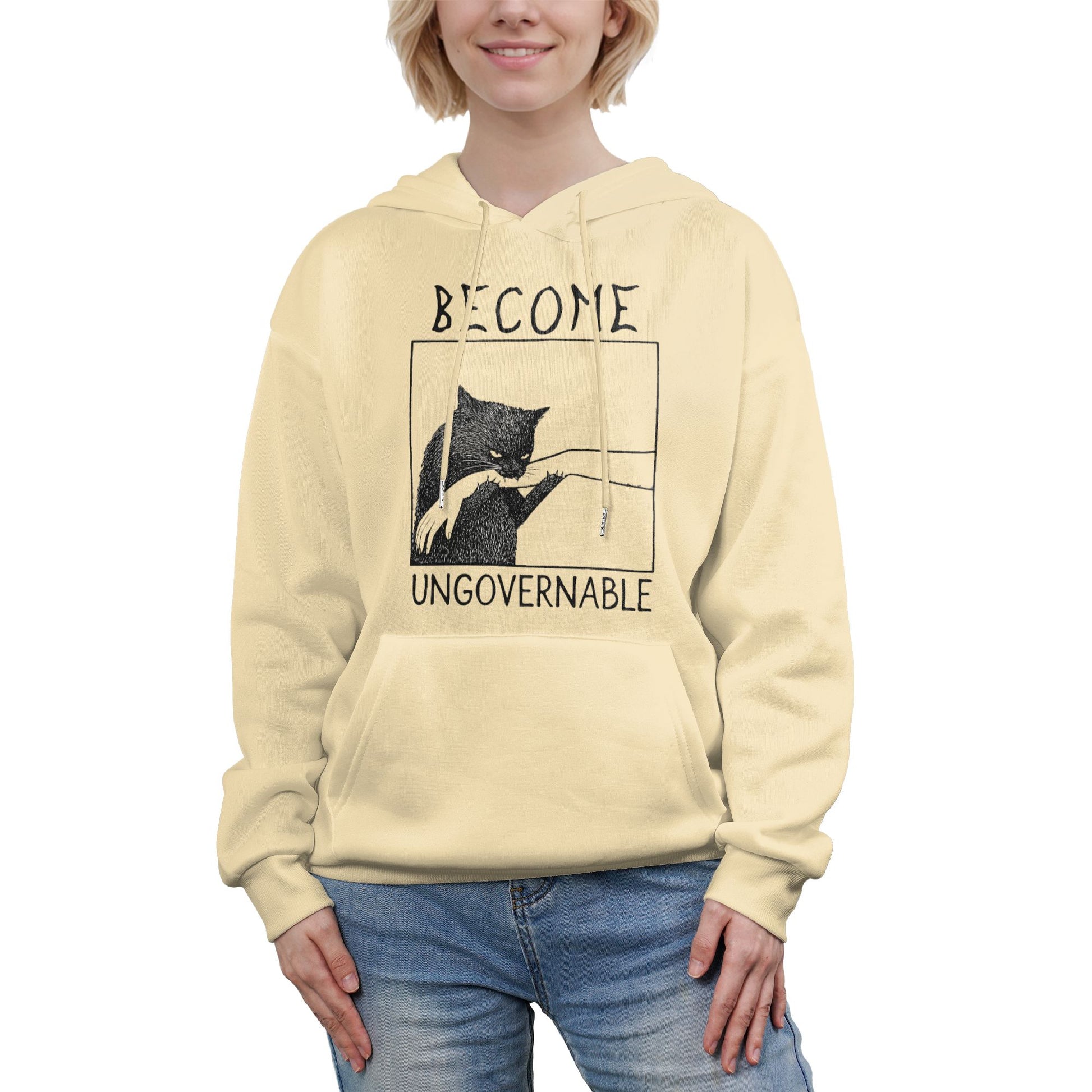 This hoodie features a striking black-ink style illustration of a cat paired with the bold phrase .Become Ungovernable. A The minimalist block-print aesthetic stands out beautifully against the soft beige fabric, making this design perfect for anyone who enjoys expressive, rebellious, and artistic graphics a fun matching outfit for their dog.