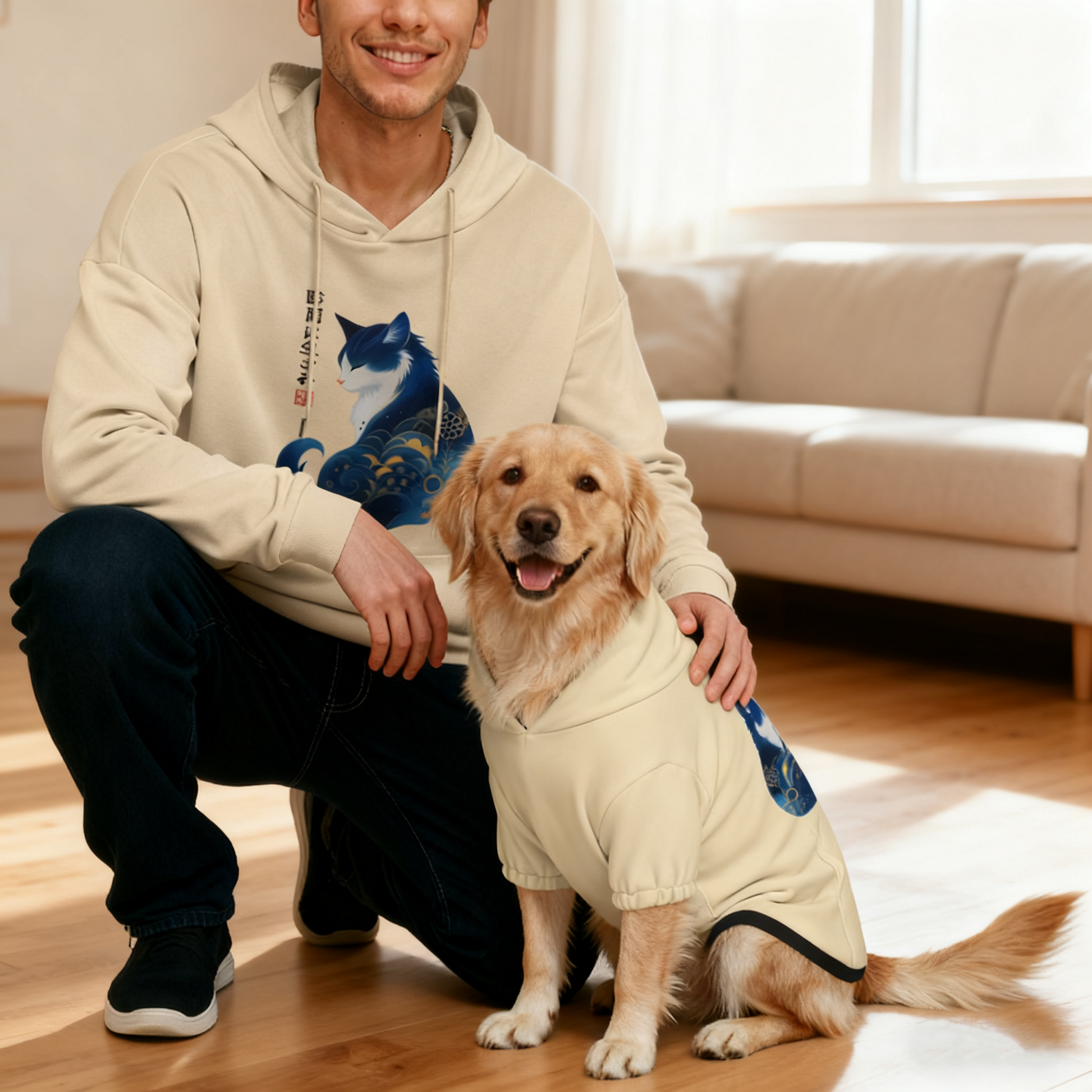 This hoodie showcases a refined illustration of a blue fox surrounded by stylized waves and gold-accented patterns, inspired by traditional Japanese art aesthetics. The vertical Japanese text adds an extra touch of cultural charm, making this set visually striking and meaningful. Your dog gets the same beautiful artwork for a perfectly coordinated look.