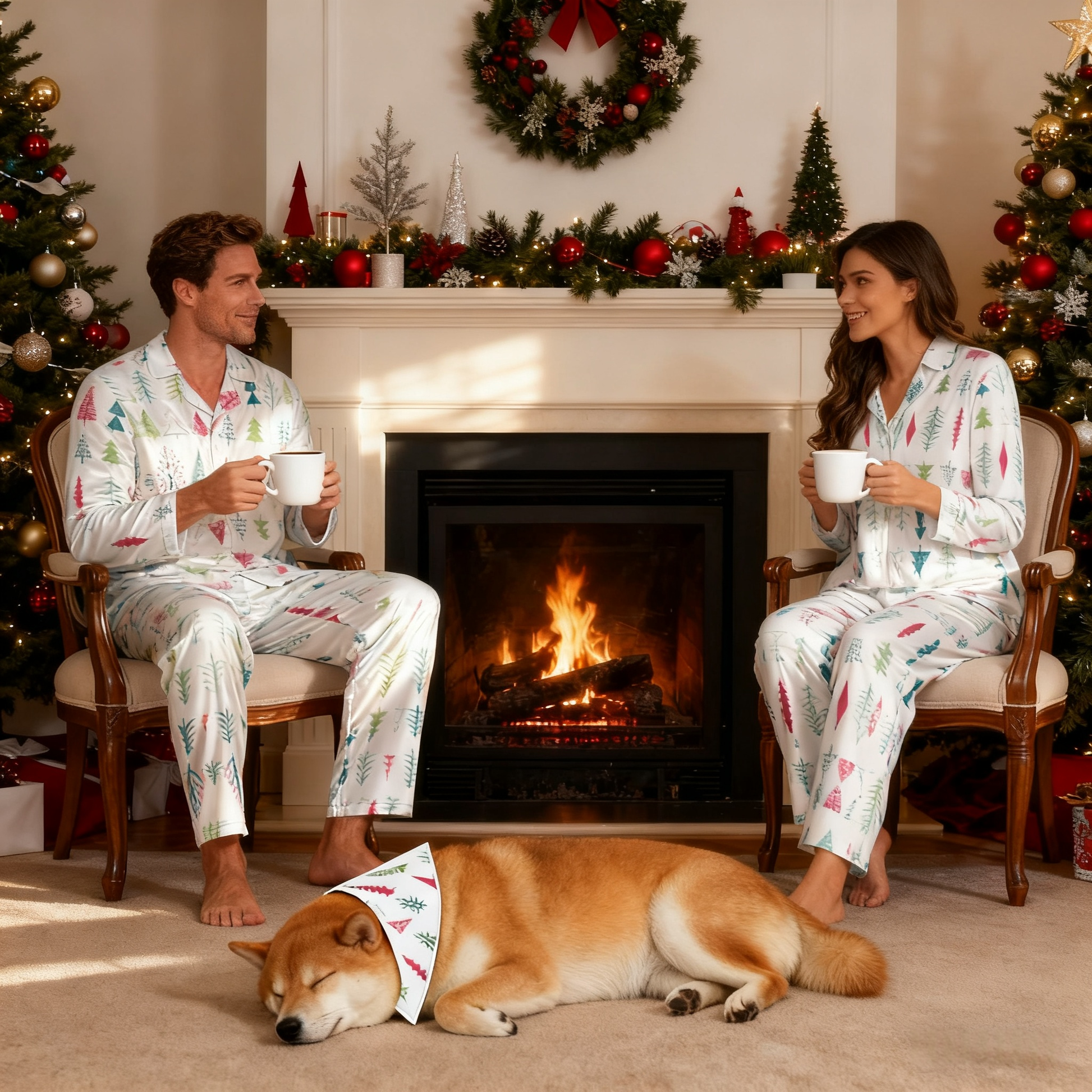 Featuring a whimsical pattern of colorful Christmas trees in soft pastel shades of pink, teal, green, and blue scattered across a clean white background. The playful hand-drawn style creates a light, cozy, and modern holiday look. Matching tops, pants, and a coordinating pet bandana bring the whole family together in festive harmony is perfect for Christmas photos, gift-opening mornings, holiday gatherings, and enjoying warm seasonal moments at home.
