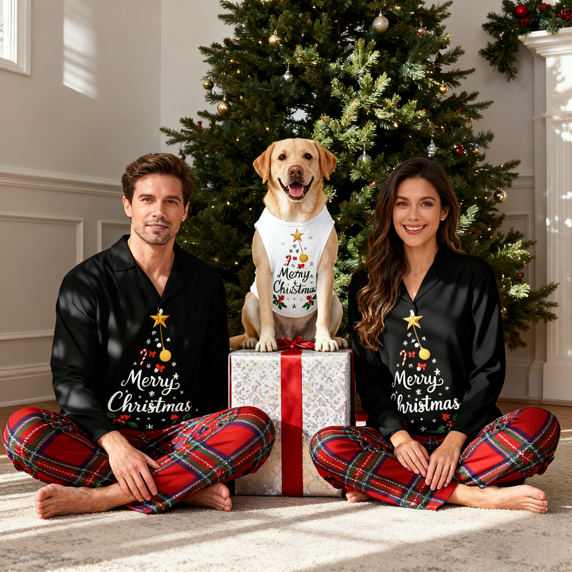 Featuring a cheerful Christmas design with a bright Merry Christmas tree graphic, adorned with stars, ornaments, and festive accents. Paired with classic red-and-green plaid pants, this set captures the warm, joyful spirit of the holiday season. Perfect for Christmas morning, family photos, gift opening, and making memories together even your furry friend can join the matching fun!